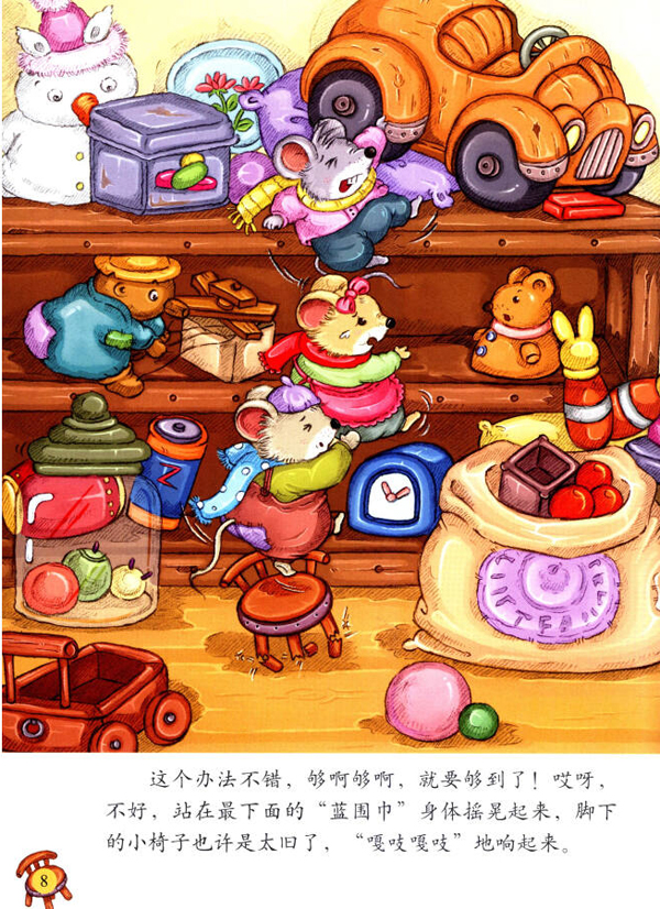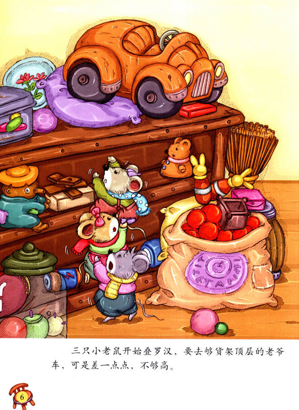 咕嘟街上有一家古老的玩具店。一天,店主人熊爷爷正在摇椅里睡觉,门口传来轻微的脚步声,他眯着眼睛,看见三只带着围巾的小老鼠走进店里。三只小老鼠想先自己选选玩具,看到喜欢的再叫醒熊爷爷!突然,他们看到了货架最顶层很旧的老爷车,那正是他们需要的!可是它放的太高了,他们怎么能够得到呢?让我们翻开书本,看看他们是怎么做的,这样做对么?