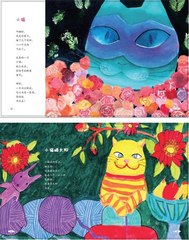 《小猫走路没有声音/林焕彰猫家族的诗绘本系列》侧重挑选了20余首充满童趣的诗歌。这一册以年龄较小的小猫为主要对象,描写小猫吃饭、睡觉、晒太阳、走路、上学、游戏等和日常生活密切相关的场景。这些诗都不长,语言活泼。前半部分的诗采用的是客观视角,记录下小猫的特征;后半部分的诗采用的是主观视角,诗中的猫是“我”的猫,侧重于写属于我的小猫像小孩子一样贪玩,也会存在孤独和忧愁的时刻,诗人借自己脑海中所创造的猫来缅怀童年的美好。这一本更贴近小猫的视角,因而也更能体现出小孩子的童真。
