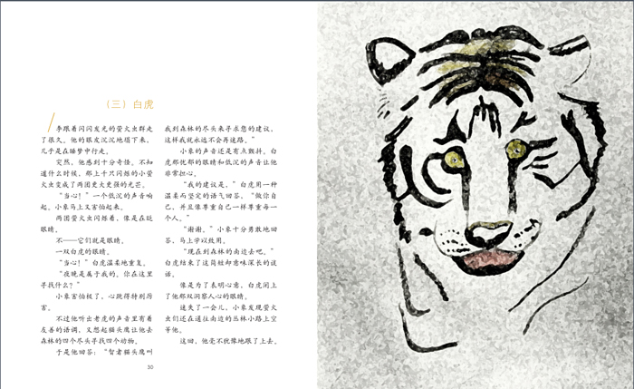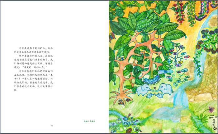 多爸黄磊在为这本书写序的时候,曾有不知所措的感觉,生怕自己的文字会“扰乱了这本书小书的静谧与温暖”。同样是两个女儿的父亲的黄磊感受到书中满溢的“厚厚的思念与温柔”。绘本是一个宠爱女儿的父亲的奇思妙想。这位相信与天赋人权一样,每一个物种、每一个生灵都有同等生存权的生态学家,这位从人类和生命的层次思索的哲学家,将自己的深邃的思想和爱化作一行行精巧轻柔的文字,化作一幅幅充满雨林浓郁斑斓色彩的图画,送给自己的宝贝女儿。青龙、白虎、玄武、朱雀,四个古老的图腾,在妲妲爸爸的笔下,变得温暖可亲。玄武甚至还为小象做了香喷喷的姜饼和香甜的蜂蜜水。