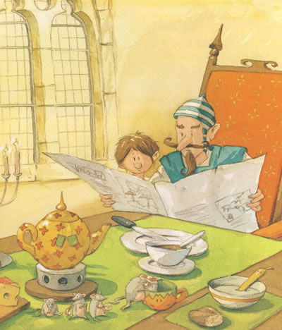 星期天的早上,小鲁弗斯很不高兴。他已经静静地坐在城堡大厅的靠椅上半个小时了,已经用食指在红色的丝绒椅套上抠出一个洞了,可是还是没有人理他。只有当小鲁弗斯的爸爸翻报纸时,才会听到他那闪着银白光芒的节日盔甲发出嘎嘎的声音。除此之外,大厅里一片安静。