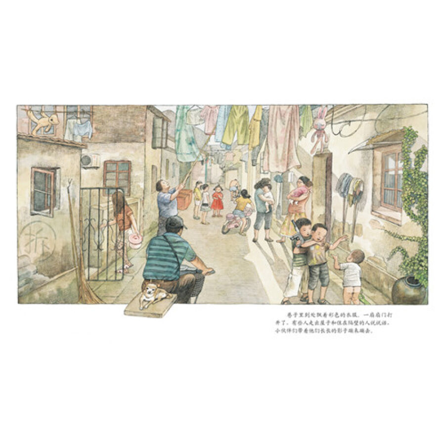 刘洵编绘的《牙齿牙齿扔屋顶》讲述了: 小妞妞的门牙掉了,爷爷说过门牙掉了要赶紧把它扔到屋顶上,这样以后才能长得高。可是爷爷不在家,妞妞决定独自去找他。妞妞一点也不害怕,因为她熟悉巷子里的每一个人,巷子是一个好大的家。找到爷爷了,一边往家走,爷爷一边告诉妞妞他们生活的巷子很快就要被拆了,就像妞妞的牙掉了很快会长出新牙那样,这里会盖起新的大楼房,但是那将会是另一种生活。