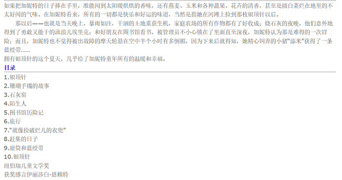 如果把加妮特的日子捧在手里,准能闻到太阳暖烘烘的香味,还有燕麦、玉米和各种蔬果、花卉的清香,甚至是圆白菜烂在地里的不太好闻的气味。在加妮特看来,所有的一切都是快乐和好运的味道,当然是指她在河滩上捡到那枚银顶针以后。 那以后——也就是当天晚上,暴雨如注,干涸的土地重获生机,家庭农场的所有作物都有了好收成;烧石灰的夜晚,他们意外地得到了勇敢又能干的流浪儿埃里克;和好朋友在图书馆看书,被管理员不小心锁在了里面直至深夜,加妮特认为那是难得的一次冒险;而且,加妮特也不觉得被出故障的摩天轮悬在空中半个小时有多倒楣,因为下来后就得知,她精心饲养的小猪“添米”获得了一条蓝绶带…… 拥有银顶针的这个夏天,几乎给了加妮特童年所有的温暖和幸福。