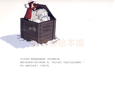 选择这一册绘本的初衷是因为它有一个浪漫的书名。三十五六度的气温,手里捧着这本《雪人》,挺有意思的。大大的开本,浅蓝色的封面,感觉有一丝清凉。光看封面,就有点摸不着头脑乐,貌似这封面上除了淡蓝的色调,再找不到其他能跟我们常规定义的雪人有关系的东西。一个毛绒绒白色巨物站在中间,周围一群科学家打扮的人围着他看。莫非,他们在研究一种衣服,雪人穿上之后不会融化?我忍不住笑了一下。慢慢翻开这本书。天啦,原来科学家把这不知名的动物当成了雪人…这…有点不可思议,接下来发生些什么呢..科学家开始研究315岁的雪人是如何永葆青春,从此南瓜成了大家的竞相购买的宠物…然后…再然后….单纯的“雪人”成了引领潮流的焦点…这个故事跟我们生活中的许多事情非常像,图画使之更加形象与趣味化…我忍不住,回味了很久