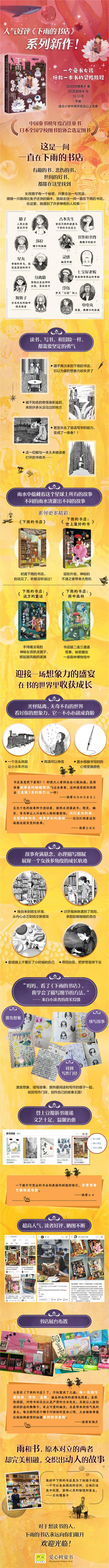 日本语文课本四年级推荐阅读 日本全国学校图书馆协会选定图书 中国童书榜年度100佳童书 读者眼中ZUI适合拍成宫崎骏动画的儿童幻想小说 ★“小雨小雨沙沙沙,下雨的书店我来啦!”念一句咒语,穿过书架组成的迷宫。欢迎来到下雨的书店,让每个孩子释放想象,在书的世界里寻找自己的故事。 ★这一次,跟随梦想成为作家的女孩璐子潜入下雨的书店,拯救一本被冷落的故事书!