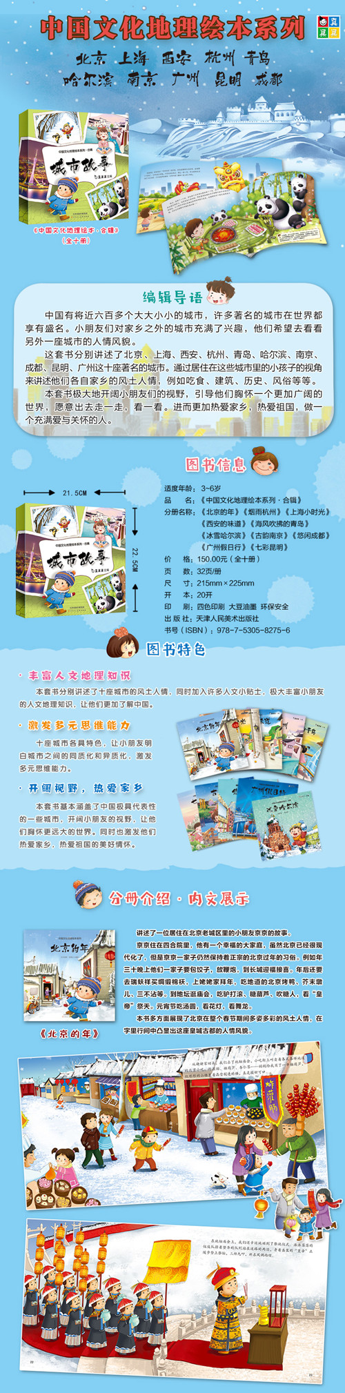 我们这套书分别讲述了北京、上海、西安、杭州、青岛、哈尔滨、南京、成都、昆明、广州这十座著名的城市。通过居住在这些城市里的小孩京京、玥玥、雨儿、安安、青青、小雪球、小梅妹、悠悠、方方、麦克的视角来讲述他们各自家乡的风土人情,例如吃食、建筑、历史、风俗等等。