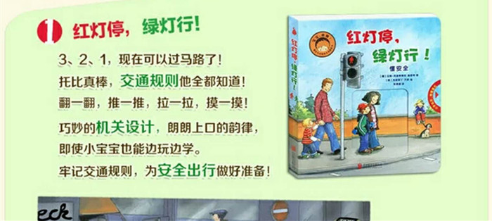 《红灯停,绿灯行!》3、2、1,现在可以过马路了!托比真棒,交通规则他全都知道!翻一翻,推一推,拉一拉,摸一摸!巧妙的机关设计,朗朗上口的韵律,即使小宝宝也能边玩边学。牢记交通规则,为安全出行做好准备!