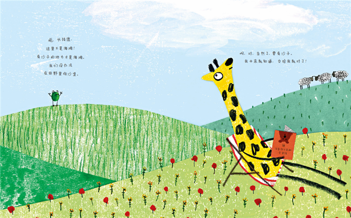 青蛙和长颈鹿要去海滩,青蛙有地图,知道路线,还知道具体的距离……可是长颈鹿根本不听青蛙说话,只是一意孤行地往前走,无奈的青蛙只好跌跌撞撞地跟在后面,一路劝说。他们经过树林和草地,到了有沙子的地方,又辗转到了有水的地方,可惜都不是海滩……最后,他们能到达度假的目的地——海滩吗?
