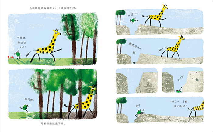 这也是一个讲述包容的故事。长颈鹿起初根本听不进好朋友的意见,固执地按照自己的方式去找海滩,青蛙虽然嘴上一直在抱怨,却付出很大的努力才跟上了长颈鹿的脚步,试图把他拉回正确的路线。