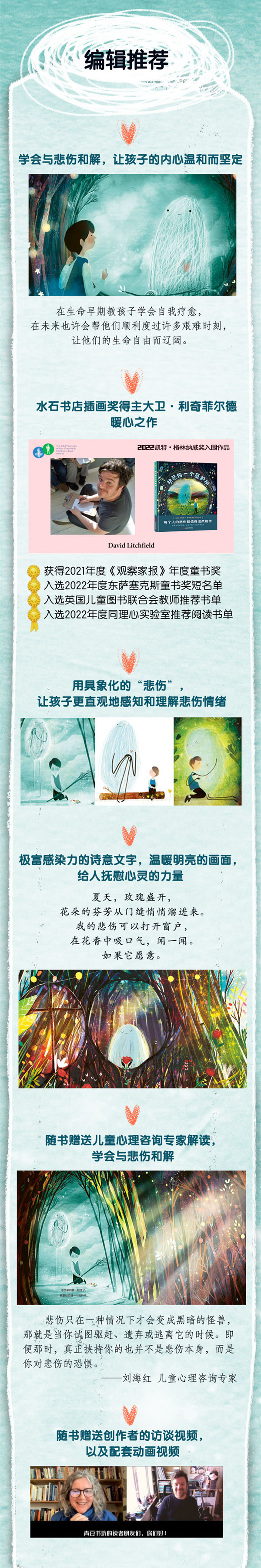 【内容简介】 每个人的悲伤都值得温柔相待。 学会与悲伤和解,让孩子的内心温和而坚定。 小男孩为他的悲伤搭建了一个庇护所。这个庇护所可大可小,可静可噪,悲伤可以随时小住。必要时,小男孩可以随时前来看望悲伤,如果悲伤愿意,它也随时可以走出去。 在庇护所里,小男孩和他的悲伤相互陪伴,共历哀 欢。更多时候,他和悲伤只是静静地坐在一起,什么也不说。小男孩知道,总有一天,他的悲伤会主动离开这个温暖的庇护所。那时,小男孩会和悲伤手牵手,一起去周游世界,去看世界的缤纷和绚丽。 【编辑推荐】 ◆安慰孩子、治愈成人的情绪主题绘本,每个人的悲伤都值得温柔相待。 ◆学会与悲伤和解,让孩子的内心温和而坚定。 ◆2022年凯特•格林纳威奖入围作品,水石书店插画奖得主大卫•利奇菲尔德暖心之作。 ◆用具象化的“悲伤”,让孩子直观地感知和理解悲伤情绪,学会情绪管理。 ◆极富感染力的诗...