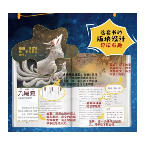 作家根据山海经中的每段原文中出现的山、树、虫、鱼、矿物、人、神和兽的特点进行整合,运用她们出色的讲故事的能力,把一段段难懂的原文改编成了一个个有趣的小故事,这样一来,原文里出现的关键部分都会作为故事中的角色出场,孩子在看故事的时候就相当于在读原文。 这样一来,山海经想让孩子不喜欢都很难了。 咱们不妨先读为快。