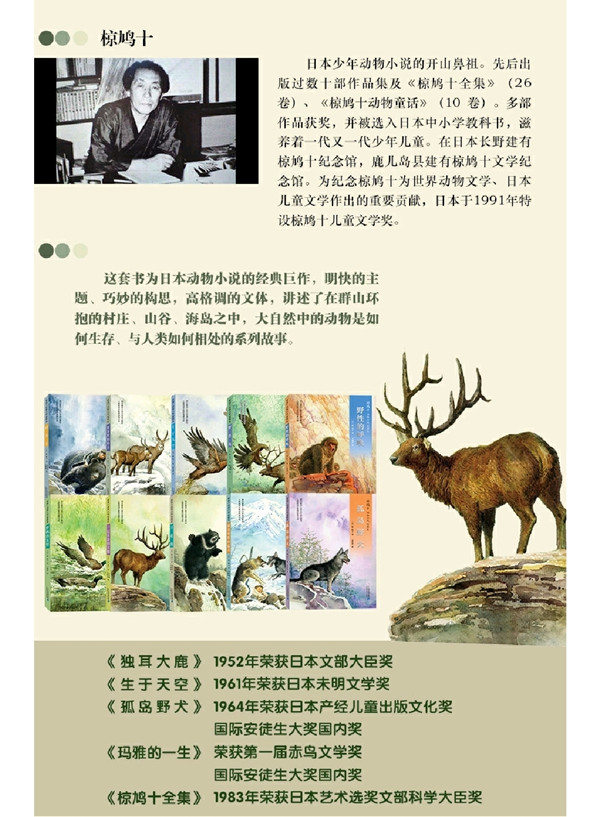 这套书为日本动物小说的经典巨作,是椋鸠十动物小说的集大成者,包含了他*代表性、*有价值的作品;《山大王》《生于天空》《一只耳朵的大鹿》《月轮熊》《阿尔卑斯的猛犬》《野鸭的友情》《野兽岛》《深谷里的羚羊》等十部。明快的主题、巧妙的构思,高格调的文体,讲述了在群山环抱的村庄、山谷、海岛之中,大自然中的动物是如何生存、与人类如何相处的系列故事。散文诗般优美的语言,细腻的情感,动人的描述,各种生动的动物,极富哲理的主题,都能人沉迷于椋鸠十的动物小说中不可自拔。