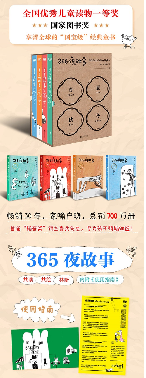 ① 《365夜故事》是由鲁兵先生专为孩子编选的“国宝级”童书。以孩子的视角为选择眼光,以儿童的口语来裁剪语言,便于年轻父母的口述。书中故事饱含智慧,纯真隽永,趣味盎然,风靡全国,总销700万册,荣获“国家图书奖”、“全国优秀儿童读物一等奖”,具有永恒的美与韵味,是享誉全球的华语儿童经典。