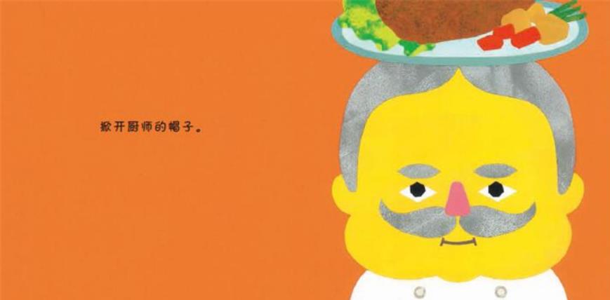 《掀开帽子》:搭配每个角色的身分,各自戴着不一样的帽子,搭配身上衣服做造型。人物表情逗趣可爱,掀开帽子后的情景更是令人大呼惊奇!例如,优雅的女士摘下花帽之后呢?哇,是时尚的发型!而厨师的高帽子下面又藏着什么呢?哇,原来是可口的烤鸡大餐…………