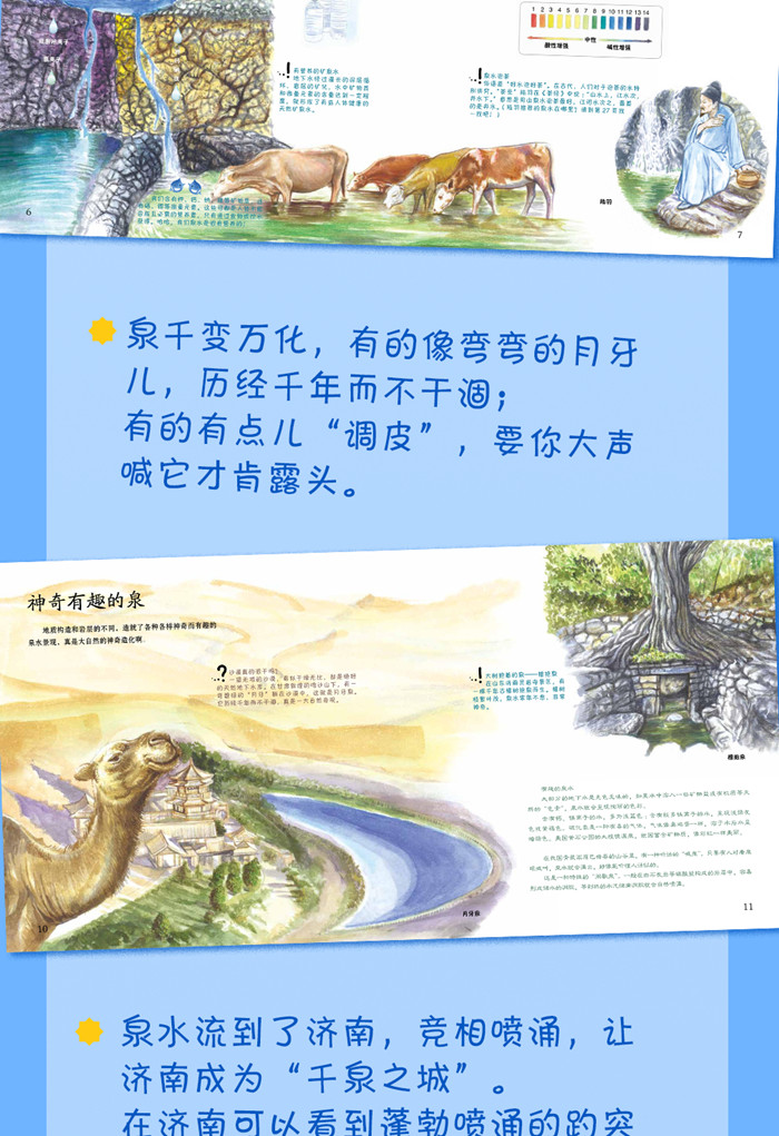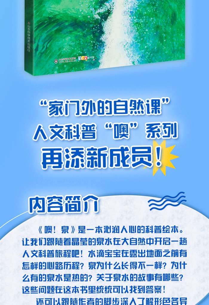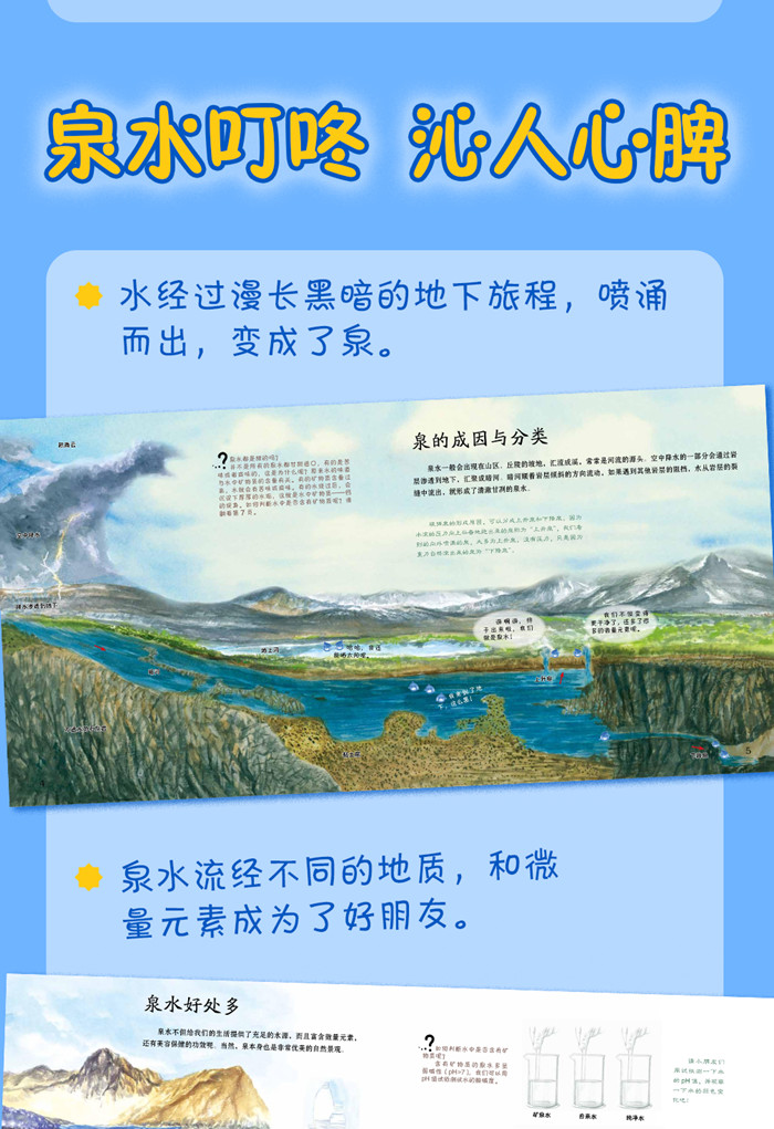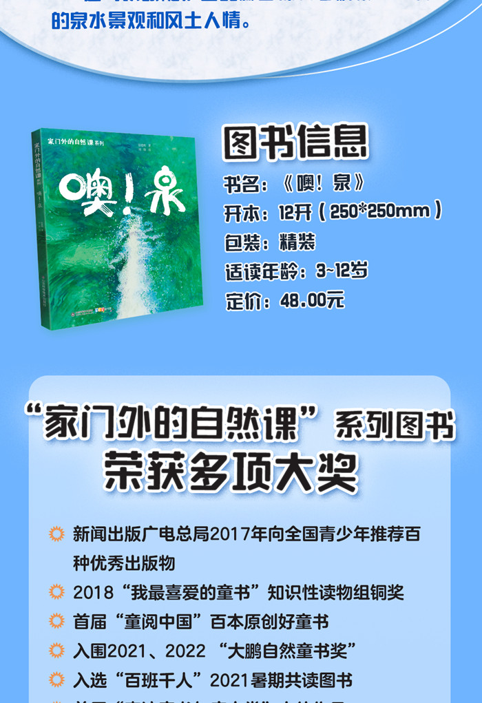 泉水汩汩流,润物细无声。《噢!泉》是一本介绍泉水的原创手绘儿童科普绘本。翻开书,我们一起遇见泉水,了解泉的成因及分类,学习泉水的功效和口味,探索关于泉水的有趣知识。跟随作者的脚步,探寻泉城济南的名泉、故事;了解全国知名的泉水,提升保护水资源的意识。将泉的自然科普知识和人文知识相结合,带读者伴着叮咚的泉水声,完成一次美妙的阅读体验。