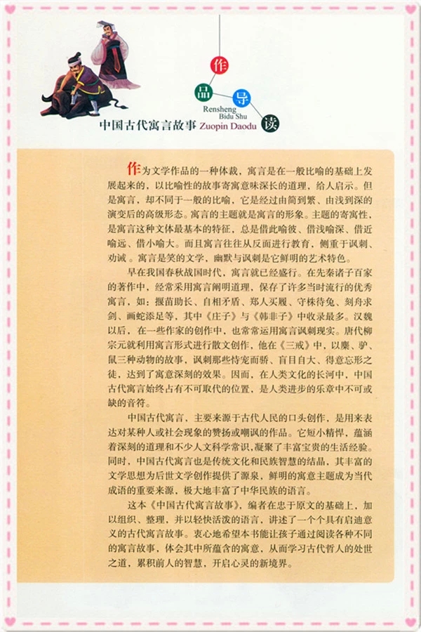 阅读中国古代寓言故事,一方面可从中了解中国古代的政治、军事、历史和社会的面貌,感受古代人们的风俗习惯、生活状况,另一方面可以学习前人留下的经验和智慧,对照历史,反省自身,以便能更好地面对当今社会的各种问题。因此,青少年了解并学习中国古代寓言故事,对成长是大有裨益的。