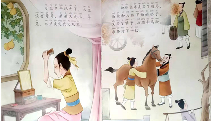 木兰是古时候的一名普通女子,从小喜欢骑马射箭。有一年皇帝招兵,男人都要应征,她父亲的名字也在名册上。可是父亲年纪大了,身体不好,木兰又没有长兄,她便扮成男儿,替父亲出征。木兰英勇善战,从军多年,数次立功。战争结束后,脱下盔甲,其他军士才大吃一惊地发现:她原来是位女子!真了不起!