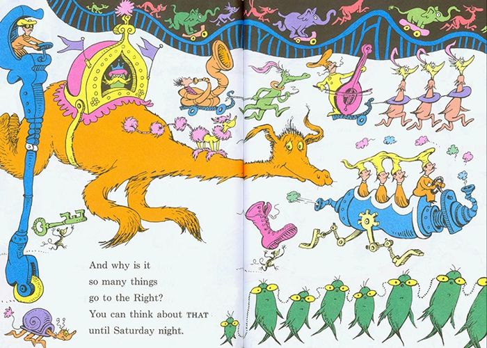 《你能有多少奇思妙想》是体现苏斯博士经典风格的又一本好书!想象力是苏斯博士一贯奉行的儿童教育准则。你能有多少奇思妙想中有着奇妙的色彩搭配 ( 黑水、白天、绿色怪鸟的粉色头发、色彩斑斓的手套等 ) ,形状古怪、长着几截尾巴的 Guff ,让孩子们的眼珠子都要掉出来的上面带冰淇淋和红色樱桃的大蛋糕,以及喝水的五十头大象,蓝色的像帽子一样的蘑菇,在房子上方漂浮着的游泳池……这些奇思妙想和新奇的视觉效果正是作者为鼓励孩子们发挥想象力而做出的典范。
