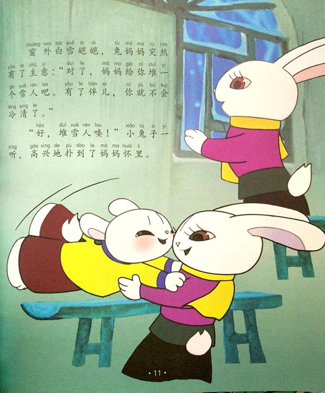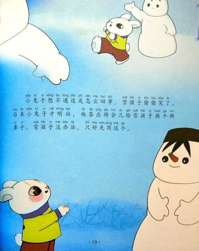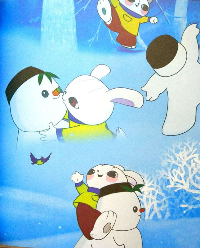 窗外冰天雪地,小白兔的家因为有火非常温暖。兔妈妈准备出门去找吃的,小白兔吵嚷着也要一起去,兔妈妈担心他受冷感冒,就给他堆了一个雪孩子,陪他一起玩耍。雪孩子堆好了,母子两个精心将它装扮了一番,小白兔有了漂亮的玩伴,不再喊着要跟妈妈一块去找萝卜。小白兔和雪孩子成了好朋友,在山谷里玩得很开心。玩累的小白兔回家睡觉了,但是一场大火不期而至,把小白兔困在了小木屋里,雪孩子为了救好朋友,奋不顾身闯进火海。小白兔得救了,雪孩子却被大火烤化,小白兔醒来后,留下了伤心的眼泪。