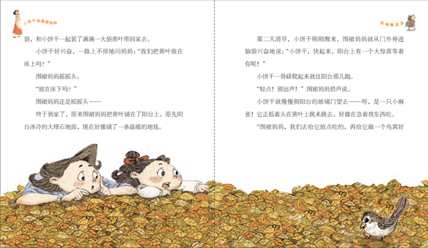《锅碗瓢盆汤》一书共有10 个故事。在《锅碗瓢盆汤》中,爱爱到小饼干家做客,不巧的是,家里只剩下一点儿面粉,几根青菜,晚饭吃什么呢?围裙妈妈想到一个好主意,她准备做一锅“锅碗瓢盆汤”,这会是什么味道的汤呢?在《小房子鸟窝》中,小饼干和围裙妈妈捡了一袋子落叶回家,她们把落叶铺在阳台地板上。第二天,阳台上居然飞来了一只小麻雀,小饼干准备给小麻雀做个鸟窝,可鸟窝刚做好,小麻雀却吓跑了,它还会回来吗?