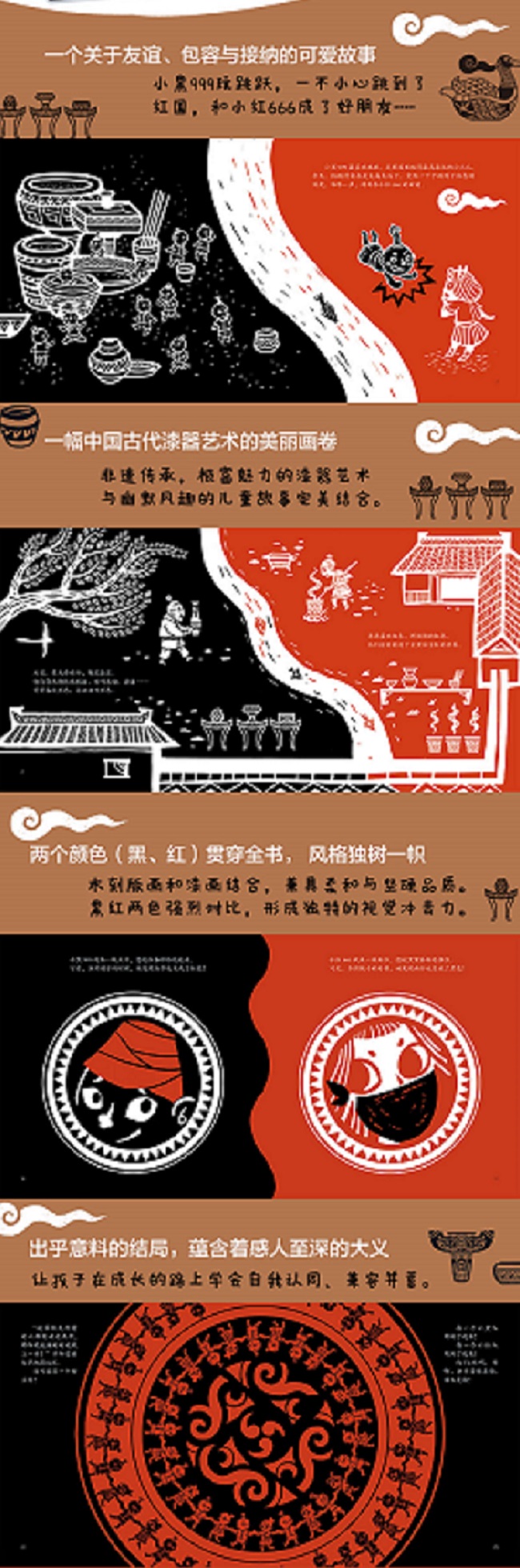 此书将极富魅力的漆器艺术与幽默风趣的儿童故事完美结合,再现中国古代的制漆工艺和精美漆器制品,让孩子在阅读中感受中国传统艺术的大美。 一个关于友谊、包容与接纳的故事,让孩子在成长的路上学会自我认同,兼容并蓄。 木刻版画和漆画结合,兼具柔和与坚硬品质。色彩上大胆采用黑红两色对比,具有强烈的视觉冲击力。