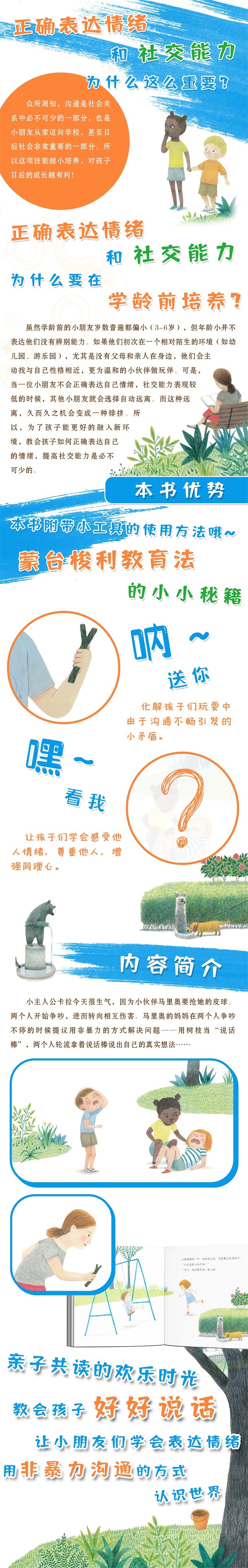 这是一本教会孩子应该正确表达情绪的绘本。同时也是一堂生动的“非暴力”沟通课程。本书可以分为两部分:第一部分,以故事再现的形式讲述孩子们在玩耍中容易出现的小争吵、小矛盾,更重要的是给出了化解矛盾正确沟通的方法。通过共同阅读和学习,家长可以轻松引导孩子表达自己的感受与情绪,正确应对愤怒、委屈等不良情绪。不仅能和孩子度过亲子阅读的美好时光,还能教会孩子“好好说话”。
