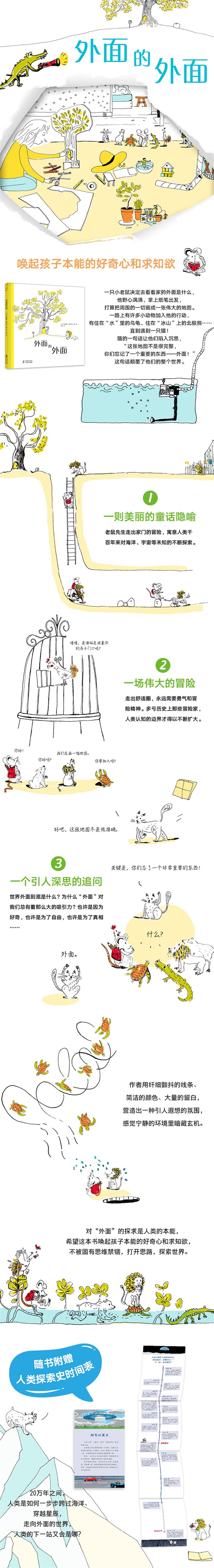 一则美丽的童话隐喻:老鼠先生走出家门的冒险,寓意人类千百年来对海洋、宇宙等未知的不断探索。 一场伟大的冒险:走出舒适圈,永远需要勇气和冒险精神。多亏历史上那些冒险家,人类认知的边界才得以不断扩大。 一个引人深思的追问:世界外面到底是什么?为什么“外面”对我们总有着那么大的吸引力?也许是因为好奇,也许是为了自由,也许是为了真相…… 对“外面”的探求是人类的本能,希望这本书唤起孩子本能的好奇心和求知欲,不被固有思维禁锢,打开思路,探索世界。 随书附赠人类探索史时间轴,20万年之间,人类是如何一步步跨过海洋、穿越星辰,人类的下一站又会是哪? 究竟什么是外面?外面的世界到底是什么样?一则看似简单的故事,结局却出乎意料,让人对自身和世界的联系产生深思。自古以来,人类始终进行着对外界世界的探索,从开始的远古人走出洞穴、到哥伦布远航跨越海洋、再到今天驾驶飞船驶向太空…… 对孩子们来说,这样能引发思考的绘本是书架上不可缺少的选择。好书要能够引导孩子发问、启发孩子进行想象,人类的不断进步正是因为无数先辈牢牢记着孩时的梦想啊。