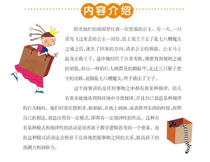 这个故事讲的是任何事物之中都有着某种规律。幼儿有着本能地从周围环境中寻找规律,并且自己创造某种规律的行为倾向。他们经常在摆积木、贴粘贴、在纸上画画,或者排列东西的时候,按照自己的想法,创造出带有一定模式,即带有一定规律性的作品。这种含有某种模式和规律性的活动是培养孩子数学逻辑思考的一个要素。而且这种模式活动还会使孩子总体地把握事物之间的关系,提高孩子的预测力和洞察力。
