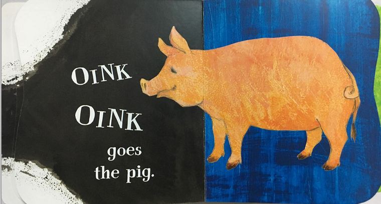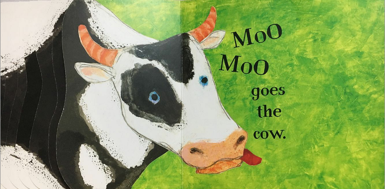 Horacek’s lovely introduction to animal noises features personable portraits of seven barnyard animals. ... Each page is die-cut in a soft curve to be smaller than the one preceding, creating a dimensional "body" for a cow on the final page, splattered with black paint and staring wide-eyed at readers with its tongue comically lolling out of its mouth.
