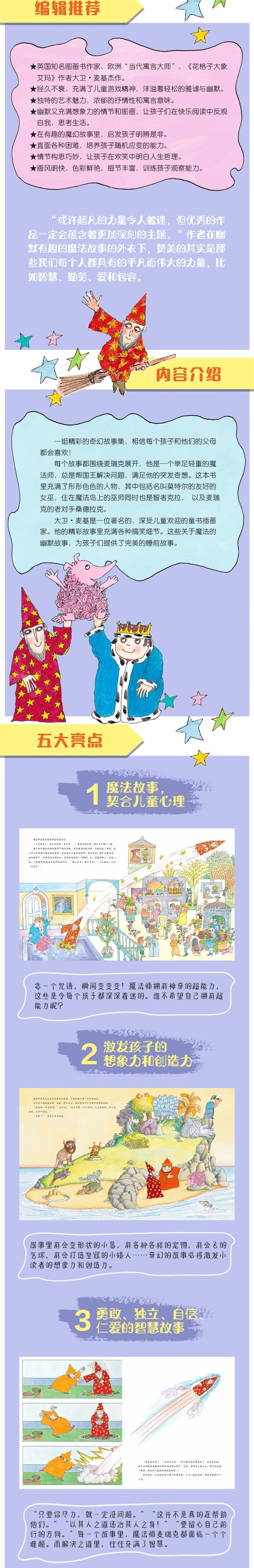 大卫·麦基是一位著名的、深受儿童欢迎的童书插画家。他的精彩故事里充满各种搞笑细节。这些关于魔法的幽默故事,为孩子们提供了完美的睡前故事。