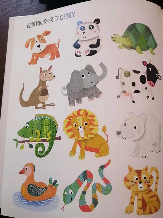 书里每一页的小动物都有些不一样,也许是表情,也许是动作,也许…… 看,小鲸鱼在喷水,大猩猩在爬树,小鸭子在游泳,小猫咪在欢快地奔跑!小朋友们,快来一起找找看,这些小动物在不同的页面里都有什么不同呢?是谁在生气?又是谁在玩耍?