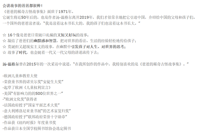 会讲故事的爸爸都很帅! 《爸爸的稀奇古怪故事集》面世于1971年。 它诞生将近50年后的今天,也是作者汤·温格尔离开2019年,我们才很荣幸地把它引进中国,介绍给中国的父母和孩子们。 一个国外的爸爸读者说:“我是读着这本书长大的,我的孩子们也读着这本书长大。” ☆ 16个像是爸爸日常随口乱编的又短又好玩的故事; ☆ 凝结了爸爸们的幽默感和智慧,把对世界的看法、生活的经验轻松地传给孩子; ☆ 荒诞但又超现实主义的故事,在幽默中引发孩子对人生、对世界的思考; ☆ 故事了时代,也会随着一代又一代父母的讲述流传下去; 汤·温格尔曾在2015年的一次采访中说道:“在我所创作的作品中,我特别喜欢的是《爸爸的稀奇古怪故事集》。” ·欧洲儿童和教育大使 ·荣获童书界的诺贝尔奖“安徒生大奖” ·起草了欧洲《儿童权利宣言》 ·美国“有影响力的的500位世界之一” ·“欧洲文化奖”获得者 ·法国政府授予“国家平面艺术大奖” ·意大利博洛尼亚童书展“的艺术家复归奖” ·德国政府授予“联邦政府荣誉十字勋章” ·作品获《纽约时报》年度童书奖 ·作品获日本全国学校图书馆协会选定图书