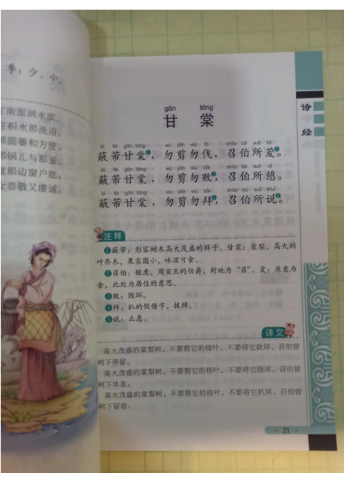 《诗经》收录诗歌265篇,按《风》《雅》《颂》三类排序。《风》是周代各地的民间歌谣,是三百篇中富思想意义和艺术价值的篇章。《雅》是周人所谓的正声雅乐,又分《小雅》和《大雅》。《颂》是朝廷和贵族宗庙祭祀的乐歌,又分为《周颂》《鲁颂》《商颂》。《诗经》内容丰富,反映了劳动与爱情、战争与徭役、压迫与反抗、风俗与婚姻、祭祖与宴会,甚至天象、地貌、动物、植物等方方面面,是周代社会生活的一面镜子。