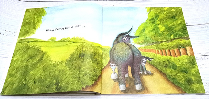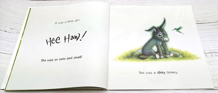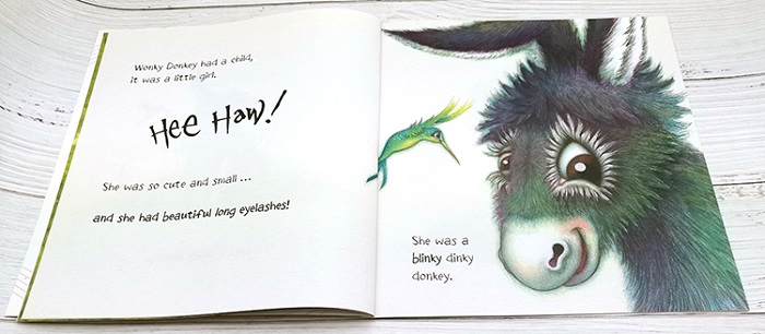 Craig smith擅长运用夸张、搞笑、无厘头的剧情惊喜,并且透重复、堆叠、朗朗上口的文字创意及句型,一层层的铺陈故事张力,再将这些故事结合他的音乐才华,用耳熟能详的弦律弹唱出一首首具有神奇吸引力、让人会心一笑、想一听再听的儿童歌谣。带有乡村歌谣的曲风,简单、容易却百听不腻,孩子只要听个几遍,马上就能跟著哼唱,一通又一遍,意犹未尽。 说是来自生活灵感的绘本故事,其实都富含作者想要传达给孩子们的重要意义。在《 The wonky donkey的故事中,袒乐孩子的摇摆驴,其实是一隻身体有缺陷的驴子,作者借此告诉孩子,即便不一样也要肯定自已,绝不能丧失自信。 整个故事完全就是一只小鸟的自言自语。小鸟在路上看见一只左摇右摆的驴子。走近一步,就看到了他身上的特点;再走近一步,又看见了他脸上的残缺;再往前走一步,又多听见了他的声音且了解了他的喜好;再往前一点,观察到了他的体型和身高...... 但是当他又往前走了一步时,这只令人疑惑好奇的驴子居然对着始终跟随着他的鸟儿做了不可原谅的事...... 重复的句型,诙谐的语气,充满惊奇的结局,一定会让孩子们笑翻天,即使是英文理解力不够的小朋友,图文相符的插画设计和不断重复的句子,配上趣味的配乐和作者搞笑音乐人的声音特质,肯定也会让他们忍俊不禁。 在读这本绘本时,除了可以感受它声音的趣味和音乐性,同样重要的,是让孩子们对照插图来了解作者和绘者独具风格的的幽默
