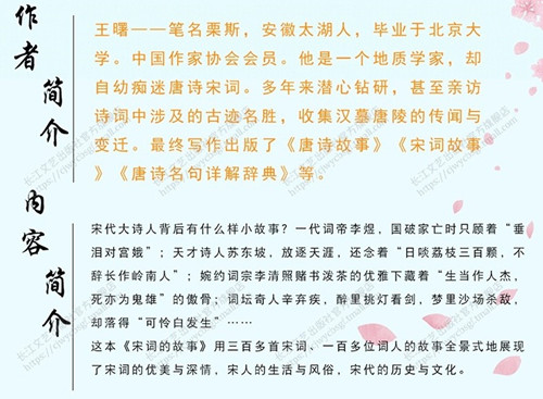 王曙,笔名栗斯,安徽太湖人。1950年考入北京大学,毕业后一直在高等院校及地质部门工作。现为中国作家协会会员,中国摄影家协会会员,教授级 工程师,中国地质学会矿相学委员会副主任,中国宝玉石学会理事及《矿物学报》编委等。 王曙致力于研究唐诗和宋词,对陕西、河南的唐宋时代古迹进行过多次实地考察,写作出版了《唐诗故事》《唐诗故事续集》《宋词故事》《新编唐诗故事集》《宋词故事集》及《唐诗名句详解辞典》等。