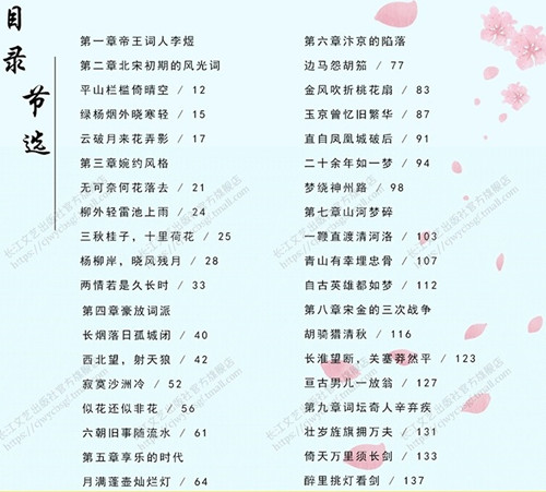 第一章 帝王词人李煜 第二章 北宋初期的风光词 平山栏槛倚晴空 绿杨烟外晓寒轻 云破月来花弄影 第三章 婉约风格 无可奈何花落去 柳外轻雷池上雨 三秋桂子,十里荷花 杨柳岸,晓风残月 两情若是久长时 第四章 豪放词派 长烟落日孤城闭 西北望,射天狼