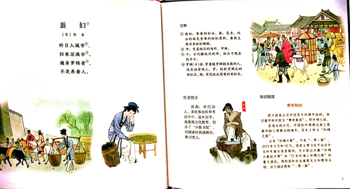 第三册一共是32首诗,宋代张俞的《蚕妇》到清代蒋士铨的《岁暮到家》。宋代是词的盛世,诗人虽然也很多,但是略逊于唐代。这本书收录了四个朝代的诗作,以宋代的居多,元、明、清三代的诗作很少。主要是想以有历史节点的诗作,来标注历史进程,让小读者可以从古诗中读到历史的脉络,读到古代人民的生活场景,读到历史上伟大诗人笔下的个人、国家、民族的兴衰。让小读者从诗和画中,读懂历史,读懂中国发展的进程。