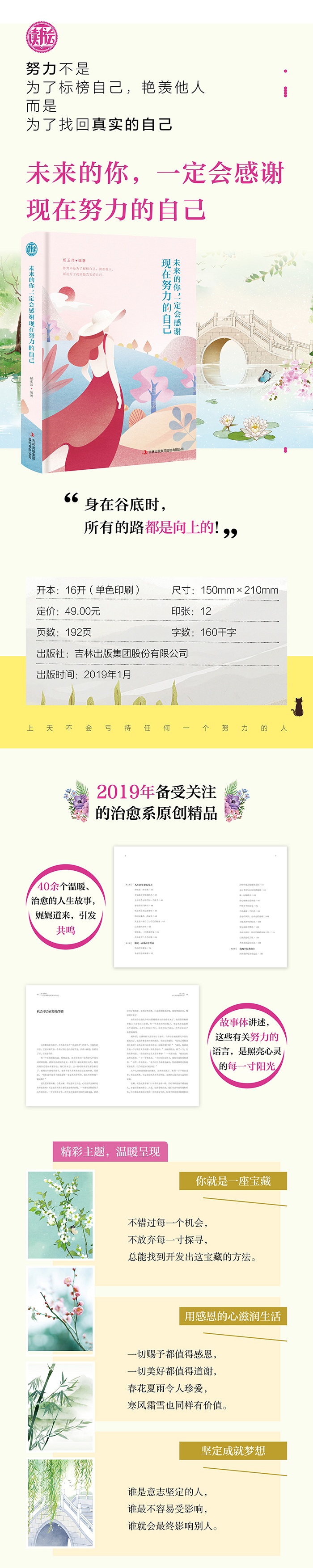 1、这是一本文艺清新的治愈系励志书籍,带个人力量的原创励志故事,让人学会扫除心灵的羁绊,勇敢行动起来。安逸也许是一种短暂的快乐,而奋斗才是一种成长的选择。从今以后,别再过你应该过的人生,告别安逸,去过你想过的人生吧!