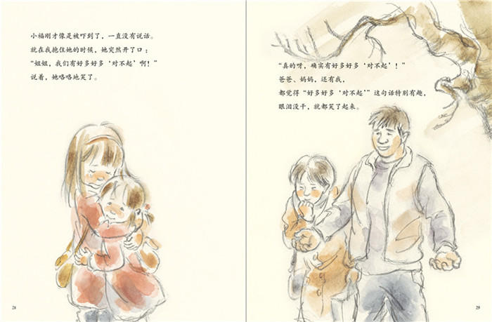 2.一个关于二孩之间、亲子之间相处的暖心故事。语言简洁,字里行间流露出姐妹之间的手足深情,以及父母与孩子之间暖暖的亲情;画风清新素雅,给读者舒适的阅读体验。