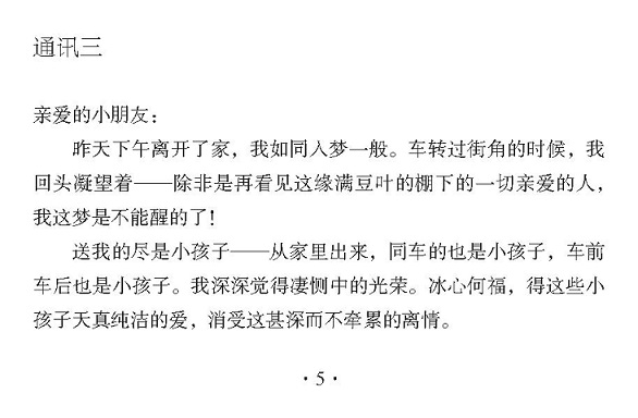 《寄小读者》有白话文的流畅明晰,有文言文的洗炼华美,誉称“冰心体”。书中多处援引诗词古文、使用文言词语,并与现代语言完美融合,充满诗性美。阅读《寄小读者》,对提高作文水平、文学鉴赏力有很大的帮助。