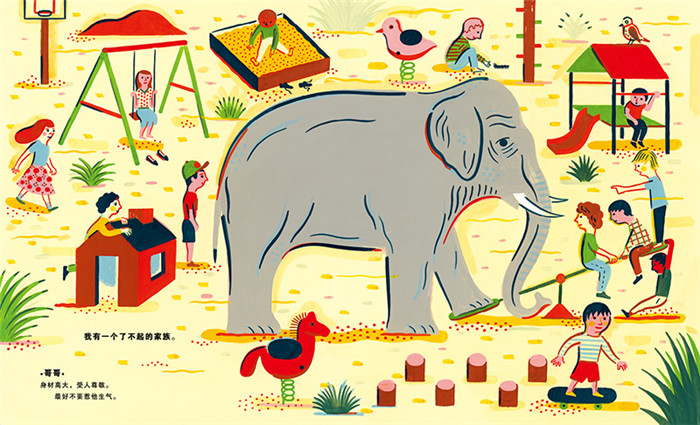 这本书是以一个孩子的口吻向别人介绍自己的家庭成员:我有一个了不起的家庭。哥哥身材高大,受人尊敬,最好不要惹他生气;妈妈个子最高。她很美丽,也很害羞,不喜欢引人注意;爸爸身上毛多,他平时非常严厉,可是一放假,就会变得和蔼可亲;奶奶温柔大方,喜欢呆在家里,她的耳朵很灵,尤其是看电视的时候;爷爷动作缓慢,看起来很疲惫,但他总是好心地把座位让给别人;当然,自己也是家庭中的一份子。本书以孩子的视角在认知家庭成员的话题上开了一个大大的脑洞。