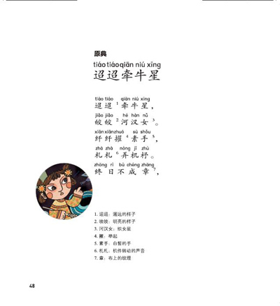 给孩子一个走近经典的机会,让孩子们去发现“春蚕到死丝方尽,蜡炬成灰泪始干”的李商隐是如此的多情;豪放大气的杜甫在大喊“国破山河在”的同时,却也有“润物细无声”的细腻;“举世皆浊我独清”的屈原是如此的倔强;“人生得意须尽欢”,“欲上青天揽明月”的李白豪放、豁达,却也有“举头望明月,低头思故乡”的愁肠;“不为五斗米折腰”的陶渊明终于找到了“采菊东篱下,悠然见南山”的闲适生活;可是告老还乡的马致远却有着少年怀志老未偿的感慨……这些曾经枯燥的名字会活生生地、有血有肉地出现在孩子们的面前,让人爱,让人疼,让人欢愉,让人感伤。原来古人的世界是如此的美好,他们也曾经生活,曾经恨过、爱过、理想过……他们也曾经是活生生的人,他们的世界其实离我们并不遥远。走近经典,让经典不再是语文课本上难以消化的硬骨头,不再是被老师逼不得已才去背的古文。它们不再高高在上,晦涩难懂,学之无味,难以应付。经典其实就在我们的身边。