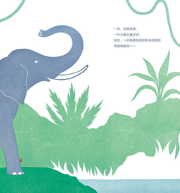 图画中大象的“大”与蜘蛛的“小”形成了鲜明的对比。虽然在过河之初,是大象驮着大家过河,但当队伍倾倒时,可以说是蜘蛛救了大家:蜘蛛吐出蛛丝救了鹦鹉,鹦鹉救了眼镜蛇,眼镜蛇救了狐獴一家……再微小的生命也是意义重大的,就像书中小小的蜘蛛也能发挥巨大的作用。
