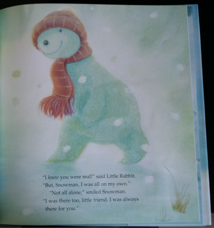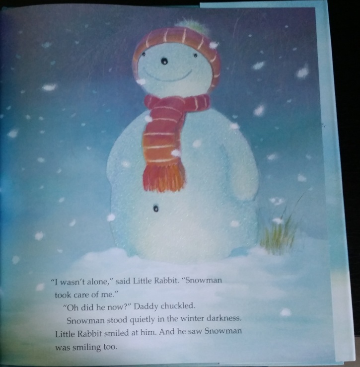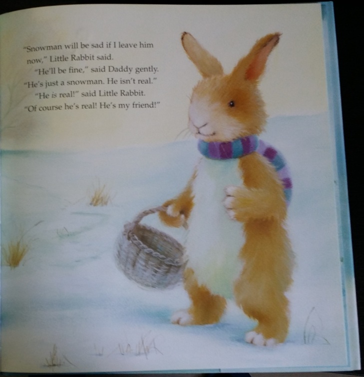 Little Rabbit and his Daddy had been very busy all morning in the wintery landscape building a big snowman. He had nice button eyes, nose and belly button and wore a red and white striped hat and scarf. Little Bunny stood in awe of the creation, but his Daddy wanted him to "find some berries" for their tea. Little Rabbit was assured that his snowman would be just fine if he went in search of the berries because, as his Daddy said, "He's just a snowman." Little Rabbit knew differently though and gave the snowman a big hug.
