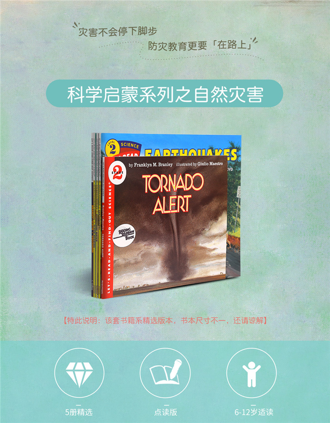 从科学启蒙系列中精选5册读本组成的自然灾害主题套装,围绕灾害的形成原理、灾害的“是与非”、如何灾前预防和怎样灾中自救这一“灾害4问”展开。一册一个主题,针对每一个需要深入的概念,书中都搜集了足够的资料给读者,涵盖多个手操小实验、历史事件科普、知识拓展tips等,从孩子的认知水平和思维习惯出发,让孩子感受文字、图像和实验组合的科学阅读魅力,帮助他们获得严谨、完整的科学启蒙。