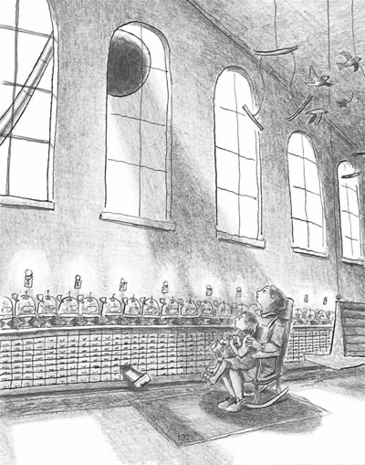 弗兰卡把霍普抱起来凑到接收器的边上,霍普把双手插进那个洛布格洛布的海洋里。记忆球的压力和重量大的让人吃惊。难怪那些挑拣工要像拿乒乓球一样拿起这些体积如此小的球!插在凹槽里没几分钟,霍普的手指就抽痛起来。这些易碎的洛布格洛布看起来一个比一个漂亮——就像精致的玻璃球——可是全部放在一起后它们的力量就不容小觑了!