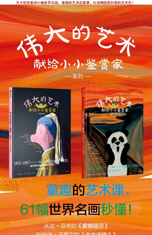 61幅高清大图,世界名画与创意重绘,搭配生动历史故事,一场世界博物馆的旅行:从波提切利的《春》到波洛克的《第5号》,从达•芬奇的《蒙娜丽莎》到安迪•沃霍尔的《金宝汤罐头》从中世纪到不久之前的过去……一翻就放不下的世界名画动物园!