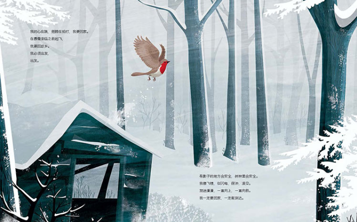 在这本精致的绘本故事中,易懂的文字和插画带领读者跟随一只知更鸟经历了它一年一度的迁徙之旅,它在圣诞期间从北部的家园飞到了英国……绘者亨德曼数字板绘的画风有一个很酷的配色(表现出了知更鸟鲜红的胸部),也将知更鸟干净利落的身姿表现了出来,逼真的鸟类形象与更抽象松弛的自然背景相结合。——《出版人周刊》