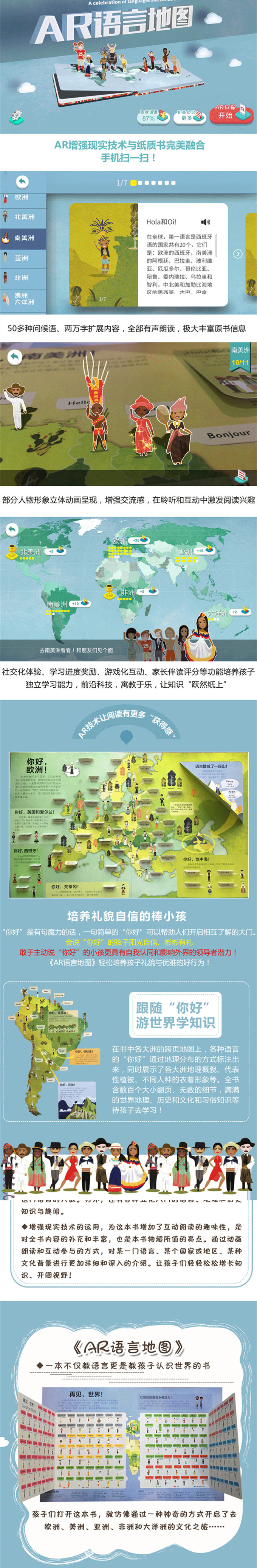 本书是“多语种”和“地图集”的完美结合,内容博大而又浅显,绘图充满童趣视角。通过在各大洲版图上不同国家和地区标注“你好”的问候方式,向小读者介绍了全球150多种语言中“你好”的表达方式。同时,还涉及象形文字、手语、书写系统知识,既让孩子们了解了全球语言文化的多元化,也认识了世界地理知识,更重要的是,通过了解各种语言的“你好”,弘扬了博爱、友谊的普世价值。本书也是一本体现最新科技手段的前沿多媒体读物。书内的立体小卡片通过采用最新AR技术,提供真人发声的各类语言的发音指导,使孩子们动动手指就能够探索语言的世界,极大提升孩子们的阅读兴趣。