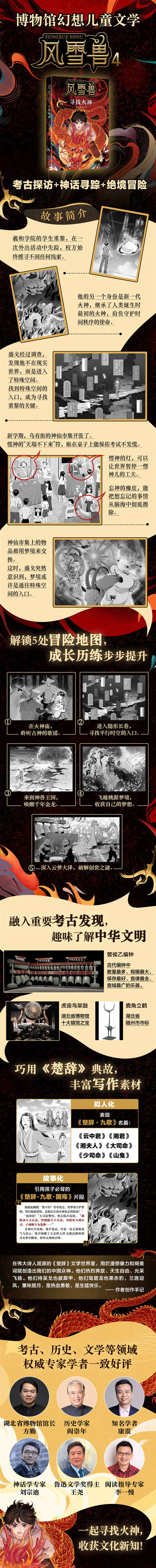 ◆博物馆幻想儿童文学“风雪兽”系列第四部。 ◆专为中国青少年打造的奇幻世界。跟随主人公前往神界时空,与憨萌神兽、远古众神并肩作战,勇闯管理人类梦境的造梦司,寻找失踪的火神。 ◆ 以荆楚文化代表文物曾侯乙编钟、虎座鸟架鼓、鹿角立鹤作为道具和角色设定,激发青少年对中国传统文化的好奇心与探索欲。 ◆兼具《楚辞》优美文风与通俗易懂的表达形式,帮助孩子提升长篇阅读能力、文本理解力与审美情趣。 ◆庄周梦蝶、梦笔生花、伯奇食梦、云梦大泽、梦境操控、入侵现实……融合东西方关于梦境的多重想象,多维度创想梦的世界。 ◆自我和解、坚定信念、不畏挫折……阅读故事,体验主人公的成长变化,完善孩子人格、培养正直善良的品质。 ◆ 历史学家阎崇年、湖北省博物馆馆长方勤、北京师范大学教授康震、神话学专家刘宗迪、鲁迅文学奖得主王尧、阅读指导专家李一慢推荐