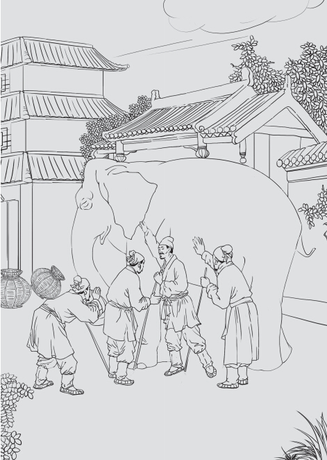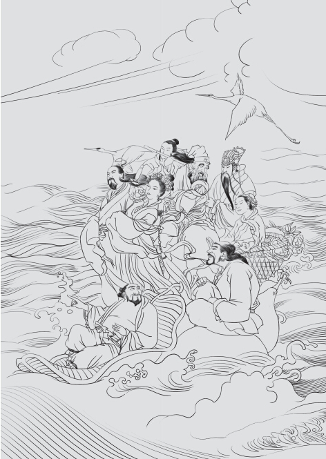 相传,吕洞宾等八位神仙去赴西王母的蟠(pán)桃会,途经东海的时候,见水深浪高,难以通行。这时,吕洞宾提议,他们各自向海里投一样东西,然后各显神通过海。于是,铁拐李把拐杖投到海里,站在上面渡过了东海;韩湘子把自己的箫(xiāo)投到海里,箫载着他渡海而过;吕洞宾、蓝采和、张果老、汉钟离、曹国舅、何仙姑也分别把自己的剑、花篮、纸驴、鼓、玉朝笏(hù)、莲花投到海里,站在上面排浪而过。八位神仙各自依靠自己的神通渡过了东海。